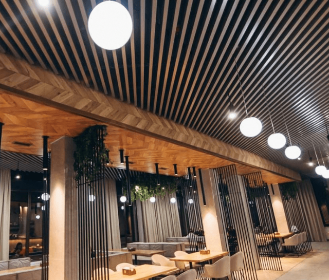 🔹 Можливість виготовлення ламелей завдовжки до 6 м і їх комбінування з іншими стельовими конструкціями дає змогу оформляти приміщення великої площі.